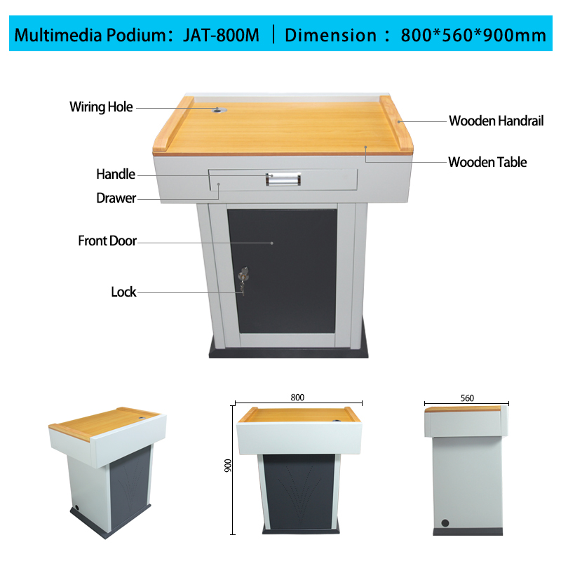 Materials and processing technology: The all steel multimedia podium, main steel frame, and cabinet lining plate are all made of high-quality cold-rolled steel plates, which are processed by CNC machining in one go and formed by hydraulic stretching without joints. The overall design is people-oriented, with rounded corners and excellent surface smoothness. The craftsmanship is exquisite and noble.