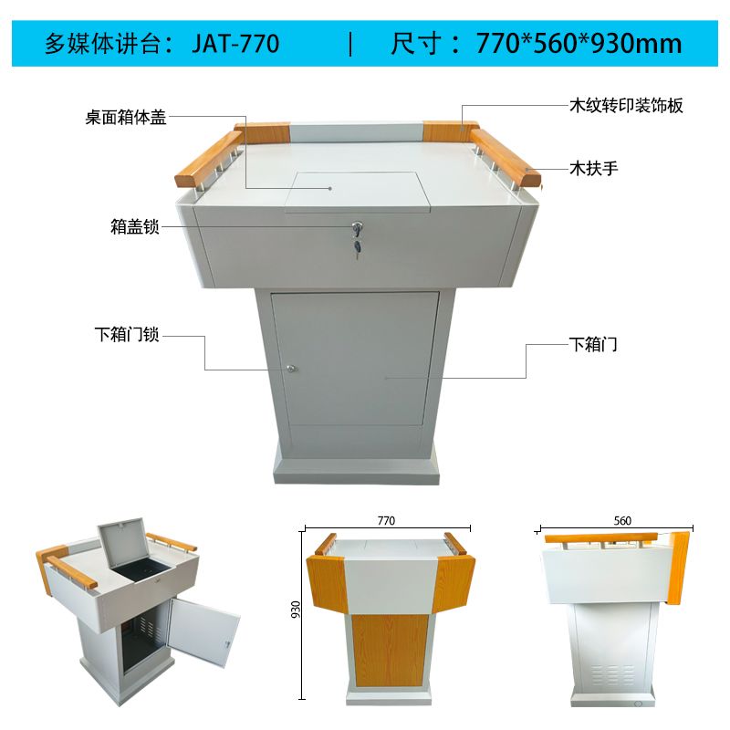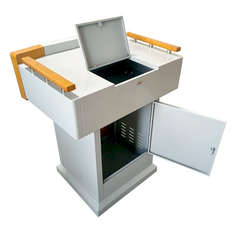 2、讲台整体采用优质冷轧钢板,无接缝,边缘及拐角均采用圆弧设计,确保学生安全,耐冲击性强,防盗性能优越。