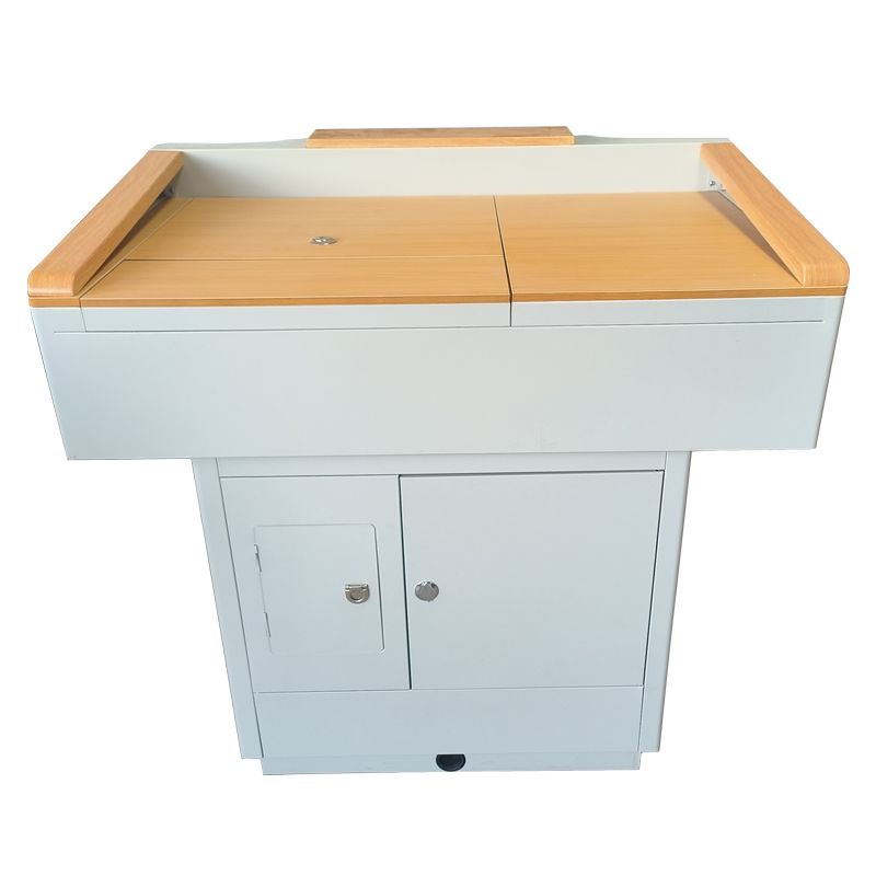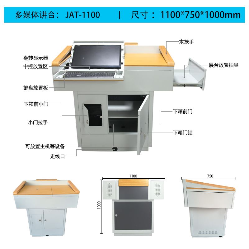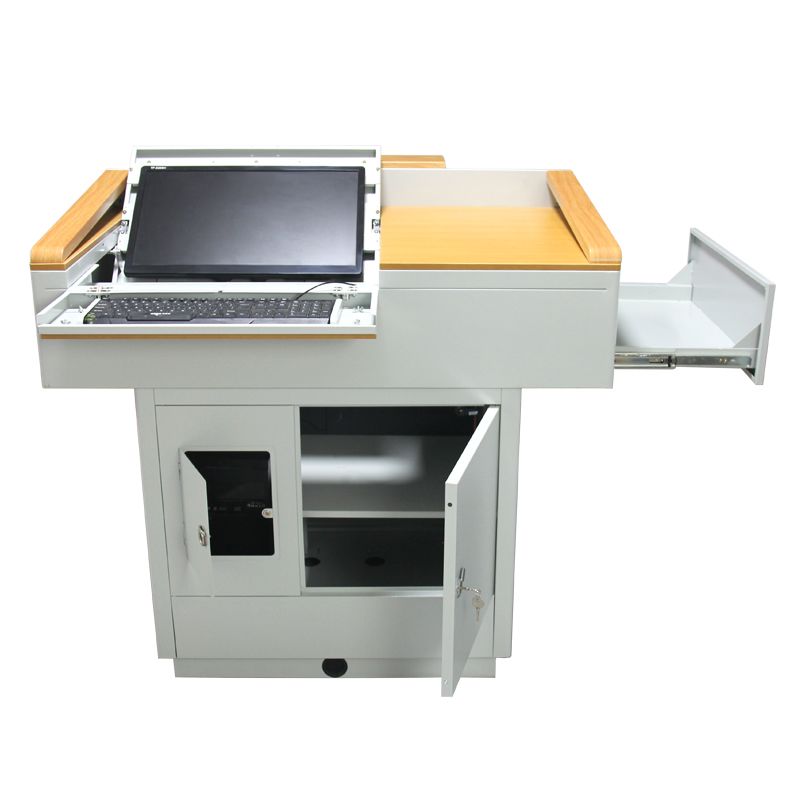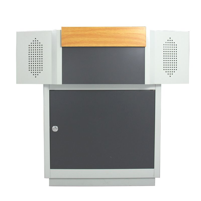 6、颜色搭配:讲台背面钢制部分采用白、灰结合,与背板木纹色形成鲜明色差,给人视觉上的享受。讲台造型采用流线型设计,设有散热孔,更人性化。